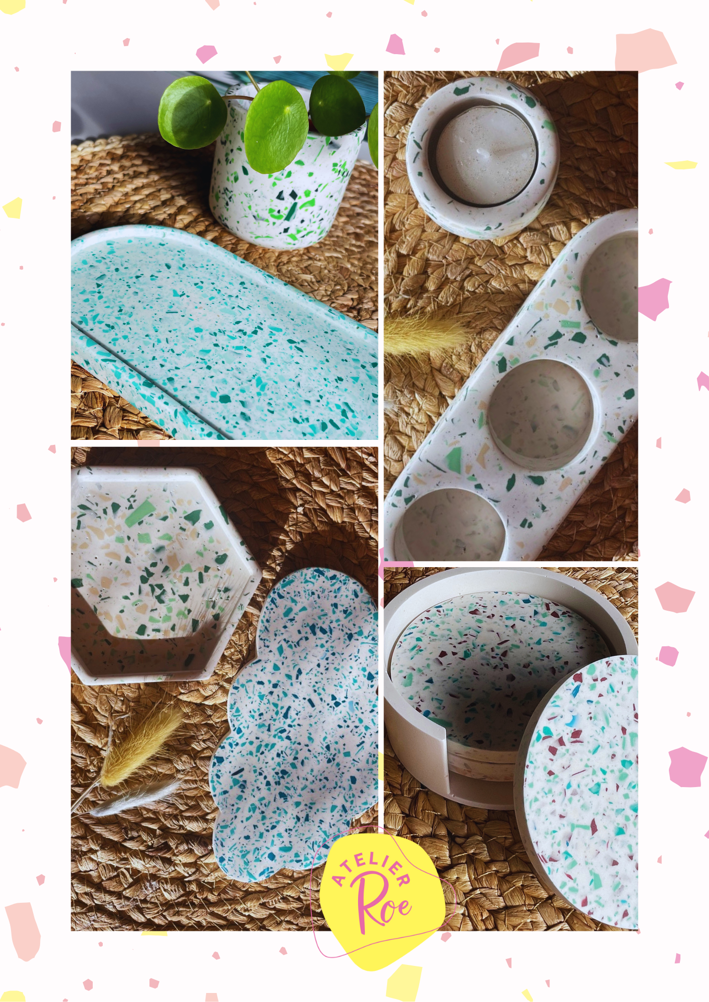 Wil je graag een creatieve en unieke workshop bij jou thuis, op kantoor of op een andere locatie organiseren? Dat kan dus! Wij komen met al het benodigde materiaal naar jou toe, zodat jij en je groep ter plekke de kunst van terrazzo kunnen ontdekken. Het enige wat we nodig hebben, is een tafel en stoelen om aan te werken, en een kraan voor water. Wij zorgen voor de rest: de materialen, de tools en uiteraard een flinke dosis inspiratie! Zo kun je in een gezellige sfeer samen met vrienden, collega's of familie prachtige terrazzo creaties maken, zonder de deur uit te hoeven.